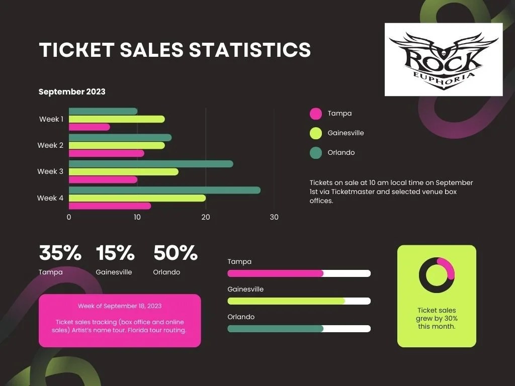 When the show is completed, we create an additional infographic to close the front. I share this with management to analyze the artist’s performance in a particular market. I can use these to see if we need to rapidly adjust any marketing or publicity campaigns for a second national leg or an international tour. I also refer to this data when it’s time to revisit booking a term for a future album release or tour package.